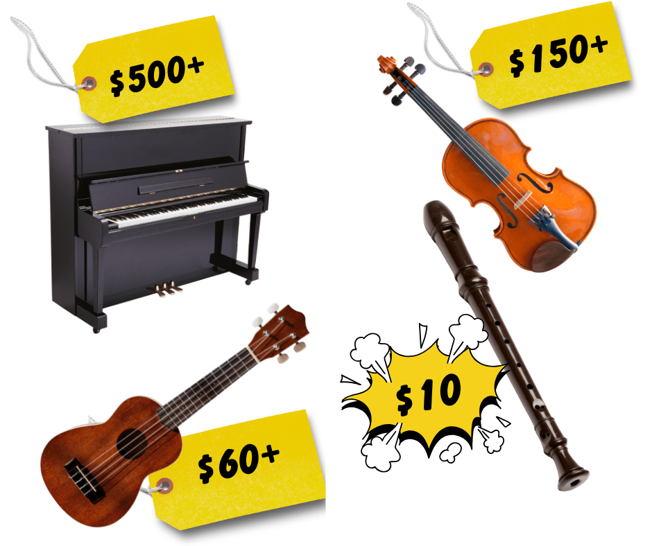 Music lessons and instruments can get expensive quickly. A beginner piano can cost $500+, entry-level digital piano (88 Weighted Keys): $150 – $500, a student violin runs around $200, and even a ukulele is $50-$100. But a good quality recorder? You can get one for under $10!
